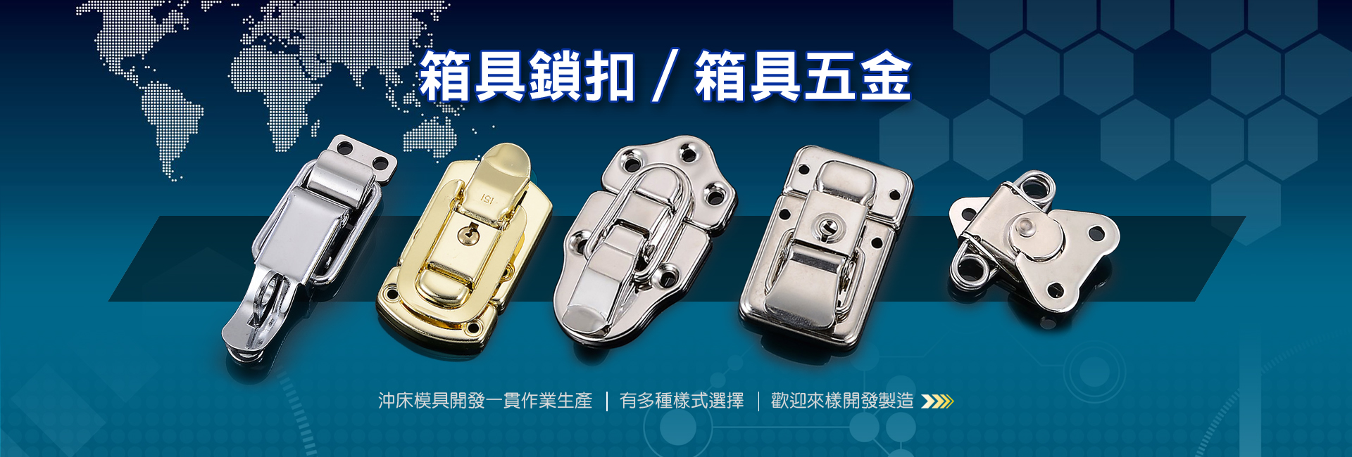 新傑工業有限公司專業開發製造箱具五金,鋁箱配件、工具箱配件、行李箱配件、旅行箱配件、航空箱配件、儀器箱配件、展會運輸器材工具箱配件及各類箱子五金配件生產製造,產品有箱具後鈕,箱子鎖扣,把手,護角及金屬口哨...等沖床加工製品。